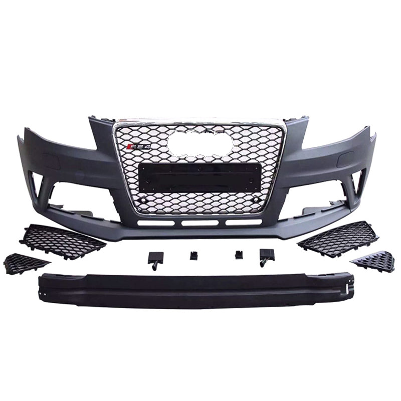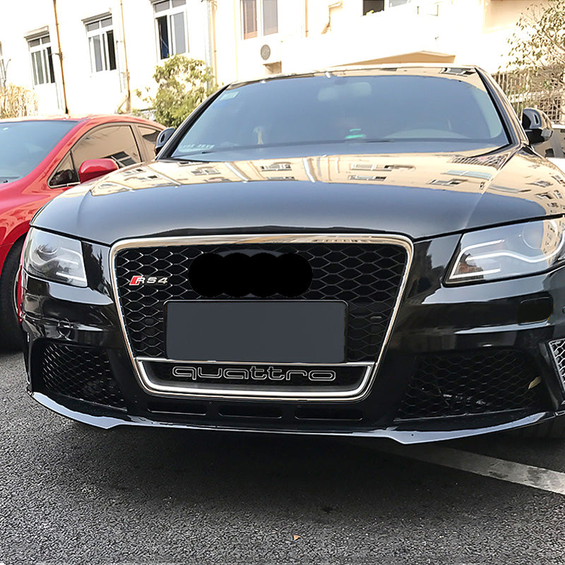 Upgrade the look of your Audi A4/S4 08-12 to the RS4 style bumper! Excellent quality and fitment! comes complete with everything you need to make a full upgrade. Center grille with Quattro frame at the bottom. fog covers with error cancellers to delete fog lights without having an error message on the cluster. All our bumper kits come with sensor holes and if yours doesnt' have parking sensors, dummy sensors can be used.